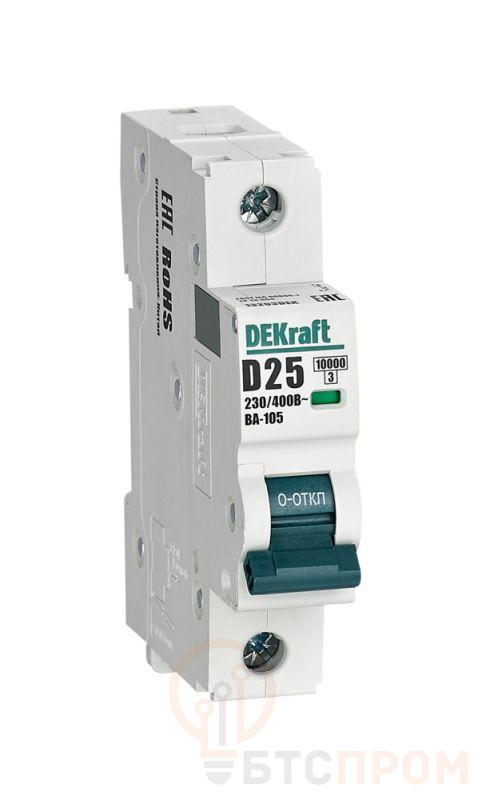 Автоматический выключатель серии ВА-105 Dekraft; 1P; ном. ток 25 А; характеристика D; откл. способность 10 кА; ширина модуля 18мм. Аппараты имеют механизм мгновенной коммутации, 6 монолитных заклепок, которые повышают прочность корпуса. Боковые каналы охлаждения повышают стабильность работы при высоких температурах окружающей среды. Есть возможность установки дополнительных аксессуаров с левой стороны устройства. Аппарат на 100% совместим с корпусами и оболочками Dekraft и Systeme Electric.