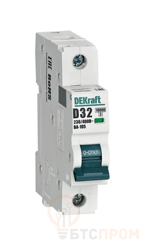 Автоматический выключатель серии ВА-105 Dekraft; 1P; ном. ток 32 А; характеристика D; откл. способность 10 кА; ширина модуля 18мм. Аппараты имеют механизм мгновенной коммутации, 6 монолитных заклепок, которые повышают прочность корпуса. Боковые каналы охлаждения повышают стабильность работы при высоких температурах окружающей среды. Есть возможность установки дополнительных аксессуаров с левой стороны устройства. Аппарат на 100% совместим с корпусами и оболочками Dekraft и Systeme Electric.