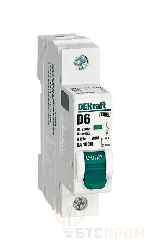 Автоматический выключатель без теплозащиты серии ВА-103M Dekraft; 1P; ном. ток 6 А; ном. раб. напряжение 230 В; кривая отключения D. Автоматические выключатели серии ВА-103М имеют специальное назначение для систем противопожарной защиты и вентиляции и выдерживают ток КЗ до 6000 А. Также они могут использоваться для нечастых оперативных включений и отключений указанных цепей. Автоматические выключатели соответствуют директиве RoHS, имеют расширенный диапазон рабочих температур от -25 до +60 °C, удобны и безопасны в эксплуатации.