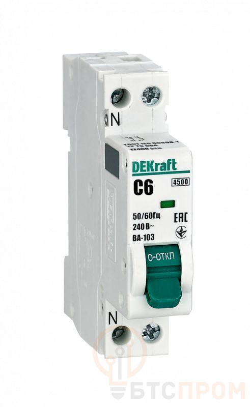 Автоматический выключатель серии ВА-103 NEW Dekraft; 1P+N; номинальный ток 6 А; характеристика C; отключающая способность 4,5 кА. Компактный аппарат, ширина 18мм. 5 монолитных заклепок повышают прочность корпуса аппарата. Окошко-индикатор всегда показывает состояние контактов вне зависимости от положения рукоятки управления. Боковые каналы охлаждения повышают стабильность работы при высоких температурах окружающей среды. Есть возможность установки дополнительных аксессуаров с левой стороны устройства. Аппарат на 100% совместим с корпусами и оболочками Dekraft, Systeme Electric.