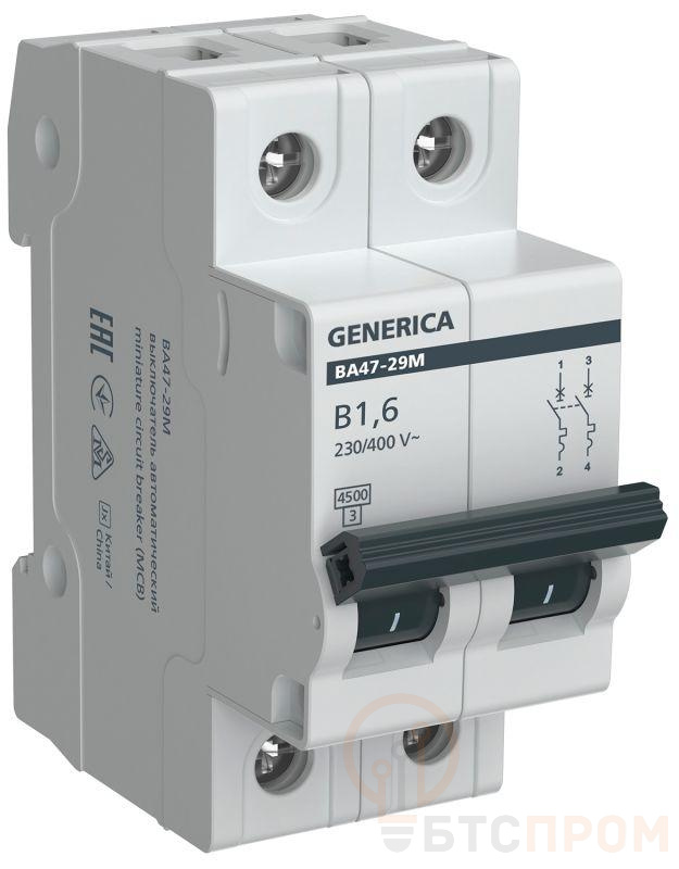 –Выключатель автоматический модульный 2п B 1.6А 4.5кА ВА47-29М GENERICA MVA21-2-D16-B-G