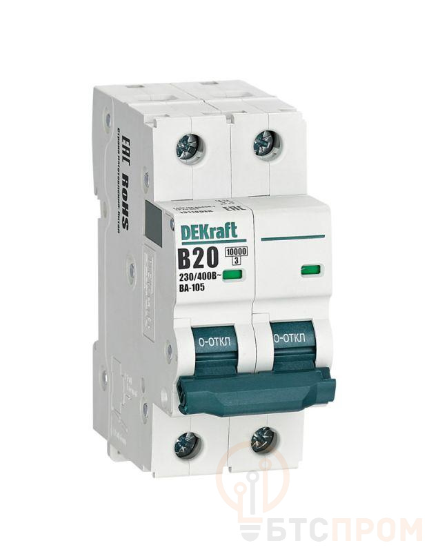 Автоматический выключатель серии ВА-105 Dekraft; 2P; ном. ток 20 А; характеристика В; откл. способность 10 кА; ширина модуля 18мм. Аппараты имеют механизм мгновенной коммутации, 6 монолитных заклепок, которые повышают прочность корпуса. Боковые каналы охлаждения повышают стабильность работы при высоких температурах окружающей среды. Есть возможность установки дополнительных аксессуаров с левой стороны устройства. Аппарат на 100% совместим с корпусами и оболочками Dekraft и Systeme Electric.