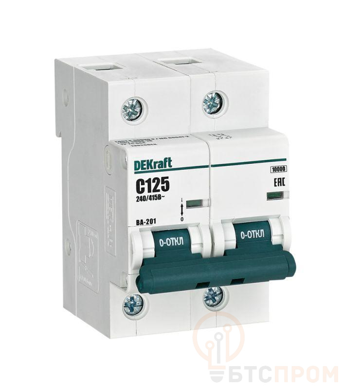 Автоматический выключатель серии ВА-201 Dekraft; 2P; номинальный ток 125 А; характеристика C; отключающая способность 10 кА; ширина модуля 27мм. Монолитная лицевая панель обеспечивает безопасную эксплуатацию аппарата. Окошко-индикатор всегда показывает состояние аппарата вне зависимости от положения рукоятки управления. Двухпозиционная защелка облегчает монтаж выключателя.