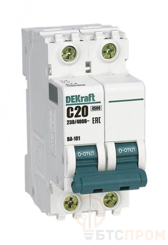 Автоматический выключатель серии ВА-101 Dekraft; 2P; номинальный ток 20 А; характеристика С; отключающая способность 4,5 кА. 5 монолитных заклепок повышают прочность корпуса аппарата. Сплошная лицевая панель обеспечивает безопасность эксплуатации аппарата. Боковые каналы охлаждения повышают стабильность работы при высоких температурах окружающей среды. Есть возможность установки дополнительных аксессуаров с левой стороны устройства. Аппарат на 100% совместим с корпусами Dekraft и Systeme Electric.