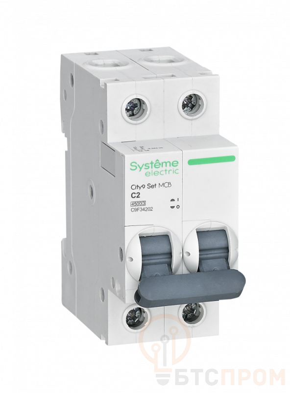 Автоматический выключатель City9 C9F34202 — это двухполюсный модульный аппарат, предназначенный для защиты электрических цепей в бытовых и коммерческих щитах. Номинальный ток устройства составляет 2 А, а отключающая способность — 4500 А (4.5 кА), что гарантирует надежное отключение при коротких замыканиях и перегрузках.