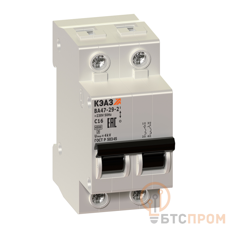 Модульный автоматический 2 полюсный выключатель переменного тока с предельной коммутационной способностью при переменном токе на номинальный ток 32 А .