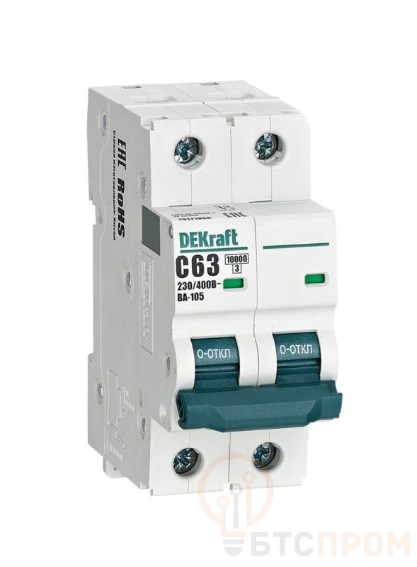 Автоматический выключатель серии ВА-105 Dekraft; 2P; ном. ток 63 А; характеристика C; откл. способность 10 кА; ширина модуля 18мм. Аппараты имеют механизм мгновенной коммутации, 6 монолитных заклепок, которые повышают прочность корпуса. Боковые каналы охлаждения повышают стабильность работы при высоких температурах окружающей среды. Есть возможность установки дополнительных аксессуаров с левой стороны устройства. Аппарат на 100% совместим с корпусами и оболочками Dekraft и Systeme Electric.