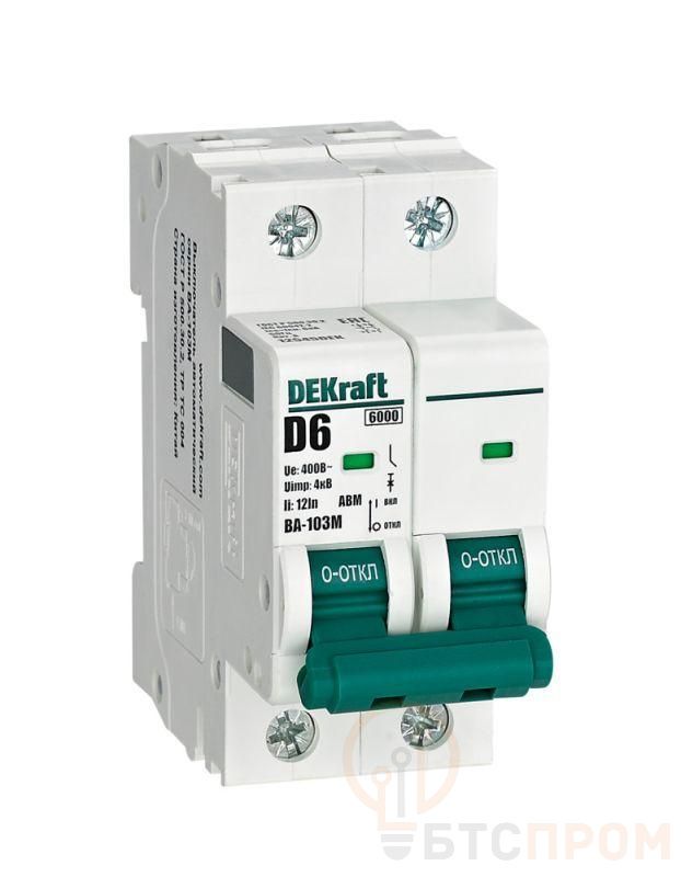 Автоматический выключатель без теплозащиты серии ВА-103M Dekraft; 2P; ном. ток 6 А; ном. раб. напряжение 400 В; кривая отключения D. Автоматические выключатели серии ВА-103М имеют специальное назначение для систем противопожарной защиты и вентиляции и выдерживают ток КЗ до 6000 А. Также они могут использоваться для нечастых оперативных включений и отключений указанных цепей. Автоматические выключатели соответствуют директиве RoHS, имеют расширенный диапазон рабочих температур от -25 до +60 °C, удобны и безопасны в эксплуатации.