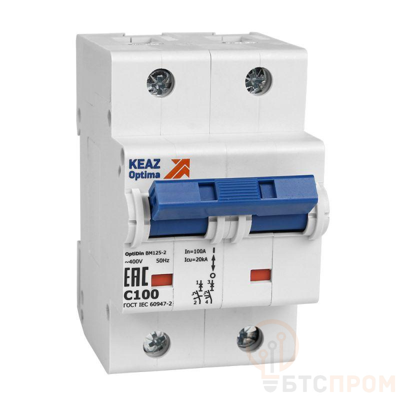 Модульный автоматический 2 полюсный выключатель переменного тока с предельной коммутационной способностью при переменном токе 20 кА на номинальный ток 80 А .