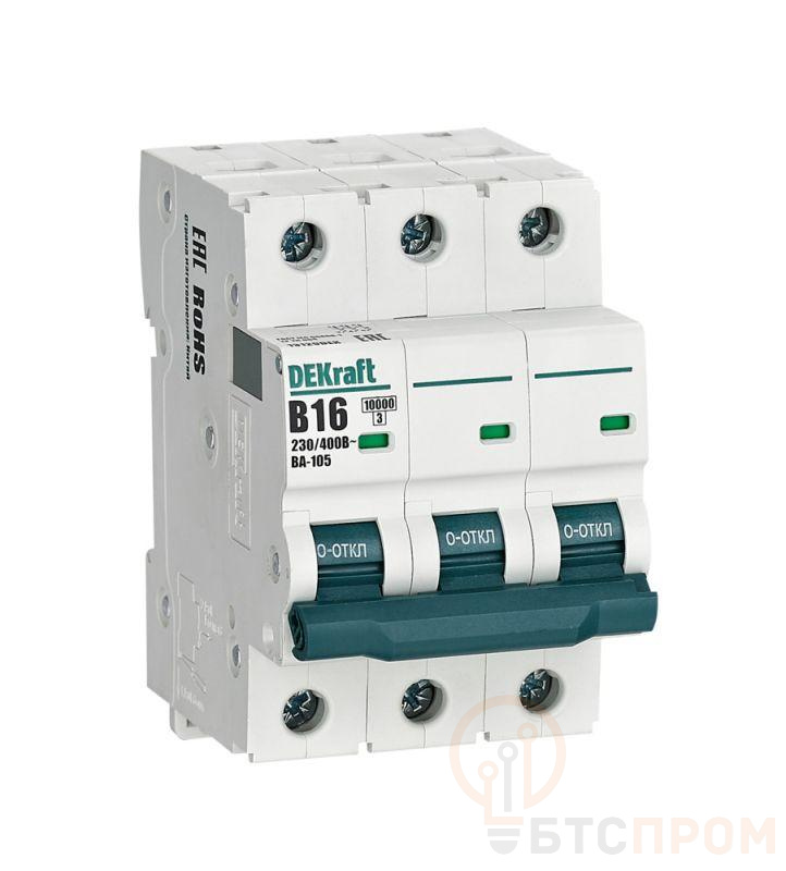Автоматический выключатель серии ВА-105 Dekraft; 3P; ном. ток 16 А; характеристика В; откл. способность 10 кА; ширина модуля 18мм. Аппараты имеют механизм мгновенной коммутации, 6 монолитных заклепок, которые повышают прочность корпуса. Боковые каналы охлаждения повышают стабильность работы при высоких температурах окружающей среды. Есть возможность установки дополнительных аксессуаров с левой стороны устройства. Аппарат на 100% совместим с корпусами и оболочками Dekraft и Systeme Electric.