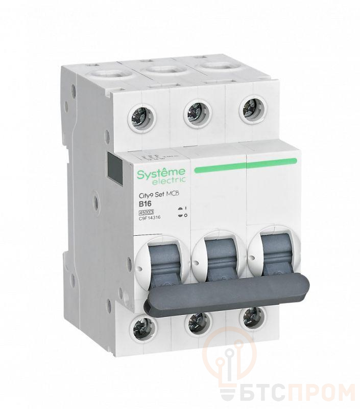 Автоматический выключатель серии City9 Set Systeme Electric, 3-полюсный, номинальный ток 16 А, характеристика B, Icn = 4.5 кА. Применяется в электрических сетях напряжением 400 В. Предназначен для защиты от перегрузок и токов короткого замыкания. Оснащен механизмом «мгновенной коммутации». Ударопрочный корпус из специального пластика с 6 металлическими заклепками. Безопасные клеммы исключают попадание кабелей в заклеммное пространство.