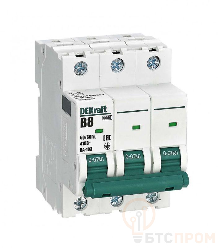 Автоматический выключатель серии ВА-103 NEW Dekraft; 3P; номинальный ток 8 А; характеристика B; отключающая способность 6 кА, что позволяет использовать аппараты в качестве вводных. 5 монолитных заклепок повышают прочность корпуса аппарата. Окошко-индикатор всегда показывает состояние контактов вне зависимости от положения рукоятки управления. Боковые каналы охлаждения повышают стабильность работы при высоких температурах окружающей среды. Есть возможность установки дополнительных аксессуаров с левой стороны устройства. Аппарат на 100% совместим с корпусами и оболочками Dekraft, Systeme Electric.