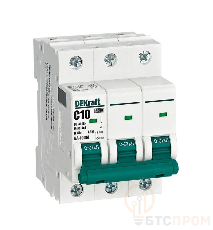 Автоматический выключатель без теплозащиты серии ВА-103M Dekraft; 3P; ном. ток 10 А; ном. раб. напряжение 400 В; кривая отключения C. Автоматические выключатели серии ВА-103М имеют специальное назначение для систем противопожарной защиты и вентиляции и выдерживают ток КЗ до 6000 А. Также они могут использоваться для нечастых оперативных включений и отключений указанных цепей. Автоматические выключатели соответствуют директиве RoHS, имеют расширенный диапазон рабочих температур от -25 до +60 °C, удобны и безопасны в эксплуатации.