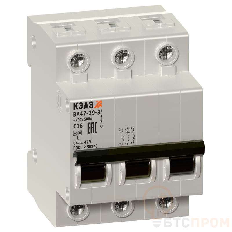 Модульный автоматический 3 полюсный выключатель переменного тока с предельной коммутационной способностью при переменном токе 4.5 кА на номинальный ток 20 А .
