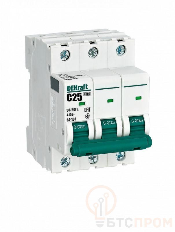 Автоматический выключатель серии ВА-103 NEW Dekraft; 3P; номинальный ток 25 А; характеристика C; отключающая способность 6 кА, что позволяет использовать аппараты в качестве вводных. 5 монолитных заклепок повышают прочность корпуса аппарата. Окошко-индикатор всегда показывает состояние контактов вне зависимости от положения рукоятки управления. Боковые каналы охлаждения повышают стабильность работы при высоких температурах окружающей среды. Есть возможность установки дополнительных аксессуаров с левой стороны устройства. Аппарат на 100% совместим с корпусами и оболочками Dekraft, Systeme Electric.