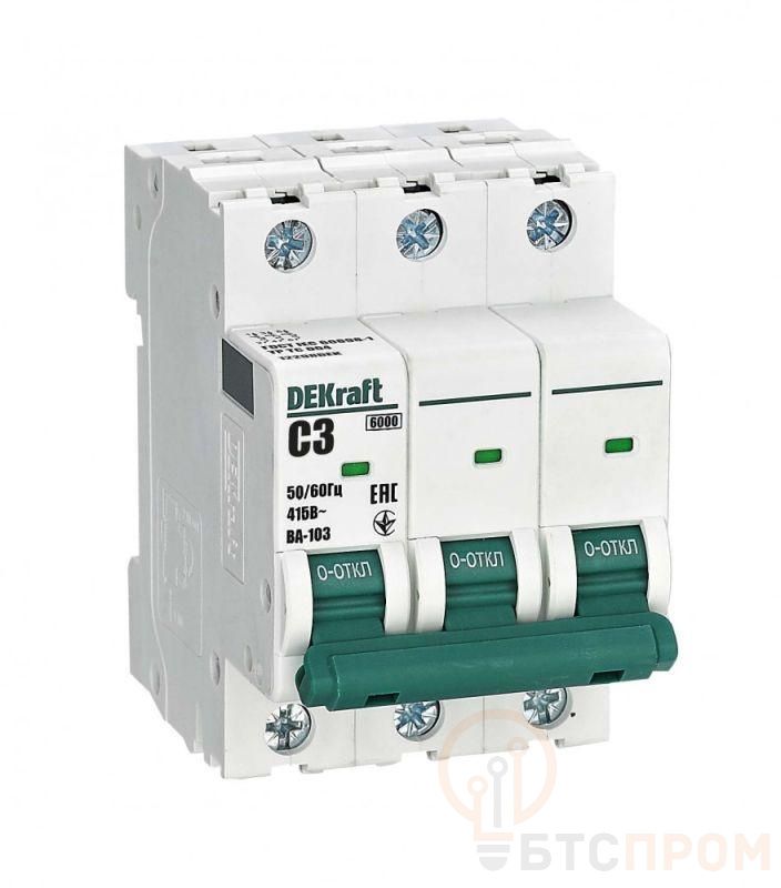Автоматический выключатель серии ВА-103 NEW Dekraft; 3P; номинальный ток 3 А; характеристика C; отключающая способность 6 кА, что позволяет использовать аппараты в качестве вводных. 5 монолитных заклепок повышают прочность корпуса аппарата. Окошко-индикатор всегда показывает состояние контактов вне зависимости от положения рукоятки управления. Боковые каналы охлаждения повышают стабильность работы при высоких температурах окружающей среды. Есть возможность установки дополнительных аксессуаров с левой стороны устройства. Аппарат на 100% совместим с корпусами и оболочками Dekraft, Systeme Electric.