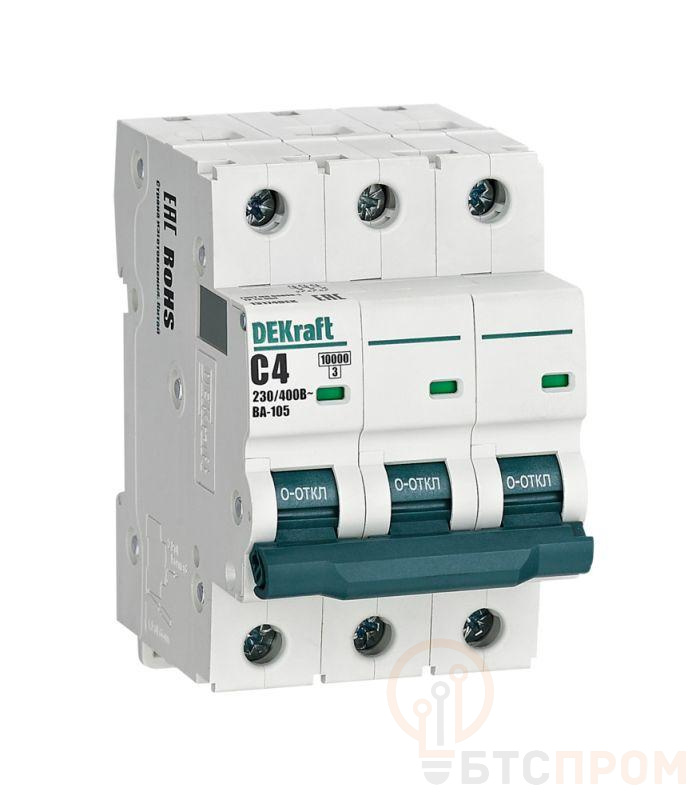 Автоматический выключатель серии ВА-105 Dekraft; 3P; ном. ток 4 А; характеристика C; откл. способность 10 кА; ширина модуля 18мм. Аппараты имеют механизм мгновенной коммутации, 6 монолитных заклепок, которые повышают прочность корпуса. Боковые каналы охлаждения повышают стабильность работы при высоких температурах окружающей среды. Есть возможность установки дополнительных аксессуаров с левой стороны устройства. Аппарат на 100% совместим с корпусами и оболочками Dekraft и Systeme Electric.
