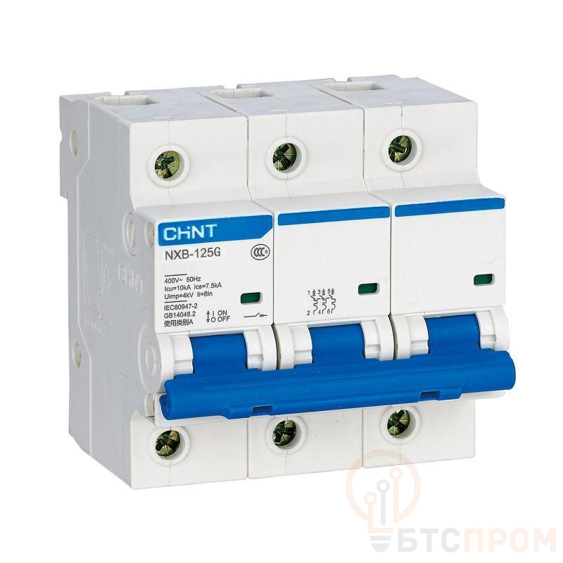 Модульные автоматические выключатели серии NXB-125 предназначены для применения в сетях переменного тока напряжением 220/400 В частотой 50/60 Гц с номинальным током до 125 А для нечастых включений и отключений нагрузок, а также защиты от перегрузки и короткого замыкания в электроустановках жилых, общественных и промышленных зданий. Применимы в бытовых и аналогичных электроустановках, с доступом не обученного специально персонала. Основные характеристики: Номинальный ток – от 63 А до 125 А Исполнение по числу полюсов – 1P; 2P; 3P; 4P Тип характеристики мгновенного срабатывания – C(8In–20%), D(12In–20%) Предельная отключающая способность – 10000 А Рабочая отключающая способность – 7500 А Механическая износостойкость – 20000 циклов В/О Электрическая износостойкость – 10000 циклов В/О Категория применения – A Класс токоограничения – 3 Степень загрязнения – 2 Степень защиты – IP20 Ширина полюса – 18 мм Монтаж – на симметричную DIN-рейку 35 мм Подключение – кабелем, шины типа PIN и FORK Сигнализация – окошко индикации положения главных контактов Автоматические выключатели серии NXB-125 дополнительно могут оснащаться следующими устройствами: - вспомогательный контакт состояния AX3-X3; - сигнальный контакт аварийного срабатывания AL-X3; - независимый расцепитель SHT-H3 или расцепитель минимального/максимального напряжения (OUVT-X3; UVT-X3; OVT-X3).