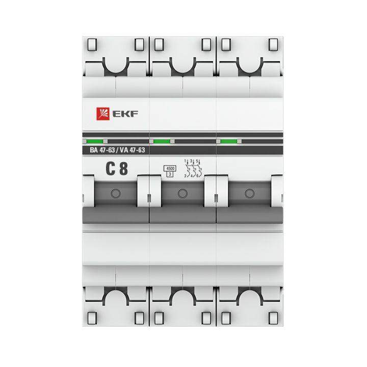 Выключатель автоматический модульный 3п C 8А 4.5кА ВА 47-63 PROxima EKF mcb4763-3-08C-pro