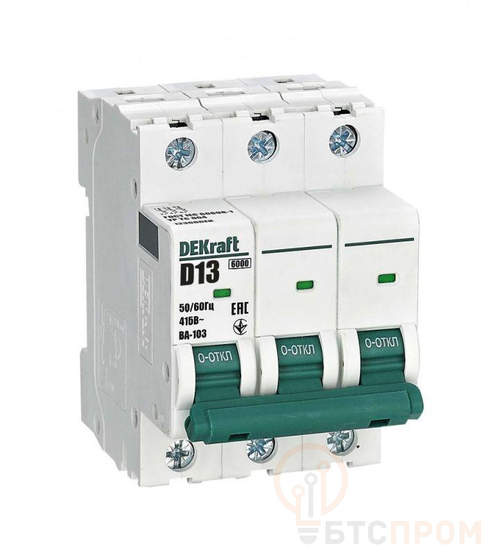 Автоматический выключатель серии ВА-103 NEW Dekraft; 3P; номинальный ток 13 А; характеристика D; отключающая способность 6 кА, что позволяет использовать аппараты в качестве вводных. 5 монолитных заклепок повышают прочность корпуса аппарата. Окошко-индикатор всегда показывает состояние контактов вне зависимости от положения рукоятки управления. Боковые каналы охлаждения повышают стабильность работы при высоких температурах окружающей среды. Есть возможность установки дополнительных аксессуаров с левой стороны устройства. Аппарат на 100% совместим с корпусами и оболочками Dekraft, Systeme Electric.