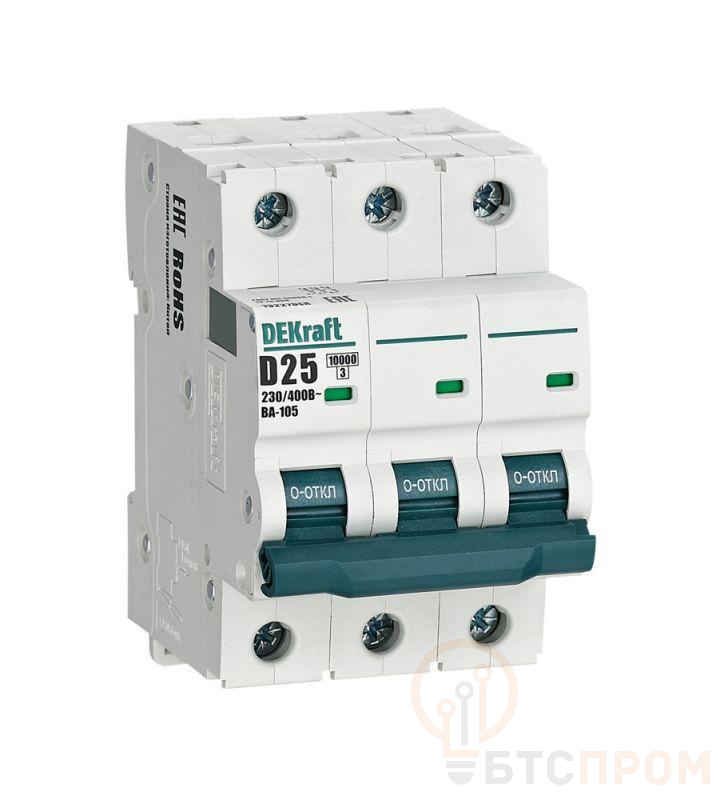 Автоматический выключатель серии ВА-105 Dekraft; 3P; ном. ток 25 А; характеристика D; откл. способность 10 кА; ширина модуля 18мм. Аппараты имеют механизм мгновенной коммутации, 6 монолитных заклепок, которые повышают прочность корпуса. Боковые каналы охлаждения повышают стабильность работы при высоких температурах окружающей среды. Есть возможность установки дополнительных аксессуаров с левой стороны устройства. Аппарат на 100% совместим с корпусами и оболочками Dekraft и Systeme Electric.