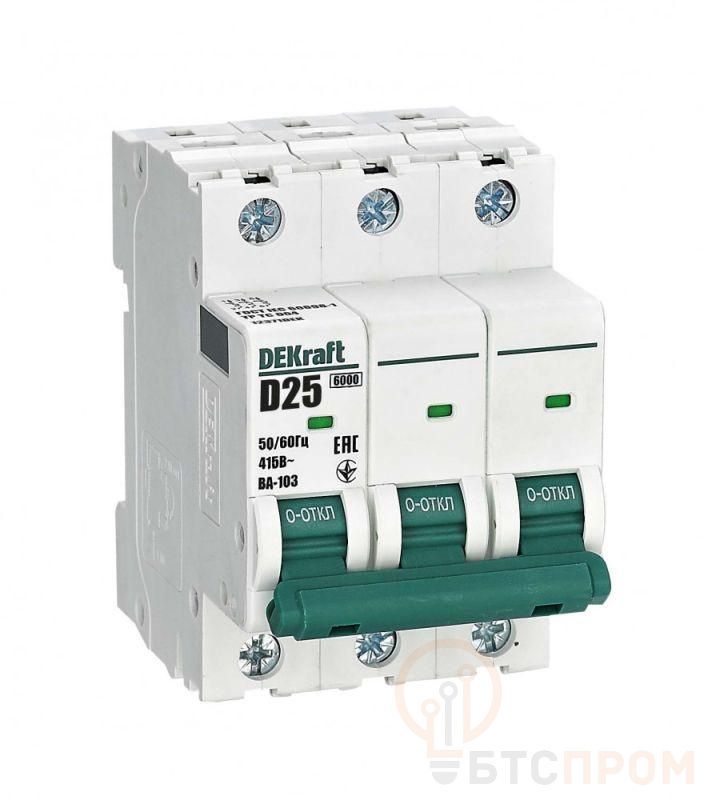 Автоматический выключатель серии ВА-103 NEW Dekraft; 3P; номинальный ток 25 А; характеристика D; отключающая способность 6 кА, что позволяет использовать аппараты в качестве вводных. 5 монолитных заклепок повышают прочность корпуса аппарата. Окошко-индикатор всегда показывает состояние контактов вне зависимости от положения рукоятки управления. Боковые каналы охлаждения повышают стабильность работы при высоких температурах окружающей среды. Есть возможность установки дополнительных аксессуаров с левой стороны устройства. Аппарат на 100% совместим с корпусами и оболочками Dekraft, Systeme Electric.