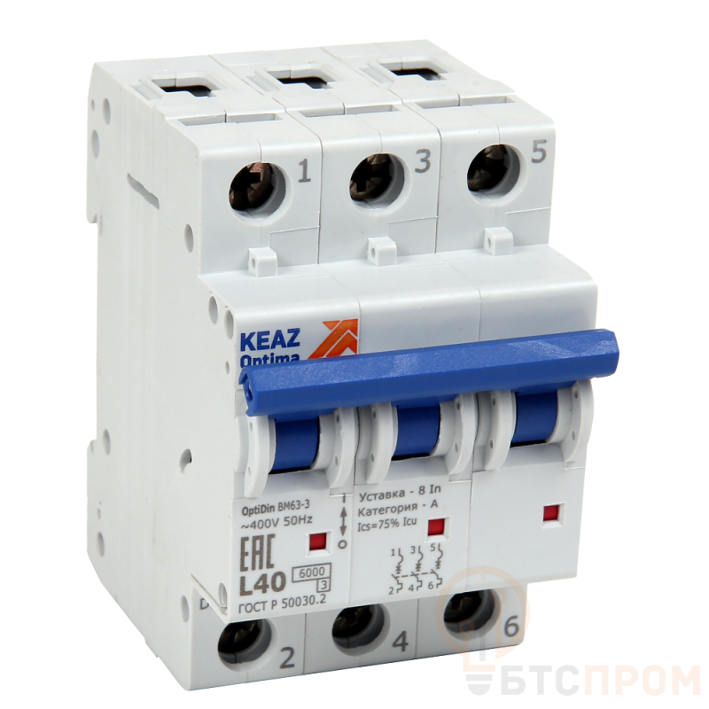 Модульный автоматический 3 полюсный выключатель переменного тока с предельной коммутационной способностью при переменном токе 6 кА на номинальный ток 63 А .