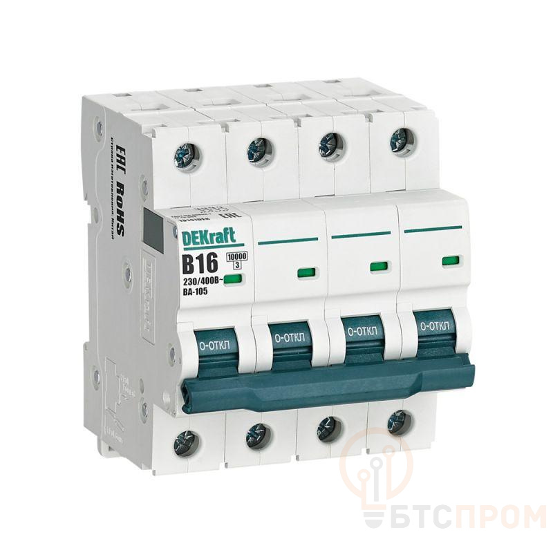 Автоматический выключатель серии ВА-105 Dekraft; 4P; ном. ток 16 А; характеристика В; откл. способность 10 кА; ширина модуля 18мм. Аппараты имеют механизм мгновенной коммутации, 6 монолитных заклепок, которые повышают прочность корпуса. Боковые каналы охлаждения повышают стабильность работы при высоких температурах окружающей среды. Есть возможность установки дополнительных аксессуаров с левой стороны устройства. Аппарат на 100% совместим с корпусами и оболочками Dekraft и Systeme Electric.