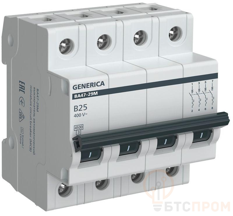 Выключатель автоматический модульный 4п B 25А 4.5кА ВА47-29М GENERICA MVA21-4-025-B-G фото в каталоге от BTSprom.by