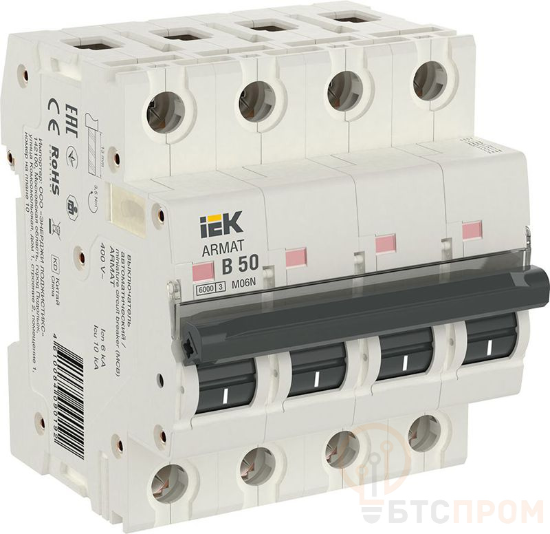 Автоматические выключатели ARMAT серии M06N предназначены для защиты цепей от перегрузки и короткого замыкания. Модельный ряд включает в себя устройства с характеристиками срабатывания B, C, D и номинальными токами от 0,5 до 63 А. Номинальная отключающая способность автоматических выключателей ARMAT серии M06N составляет 6 кА. Предельная отключающая способность варьируется в зависимости от номинала от 10 до 50 кА.