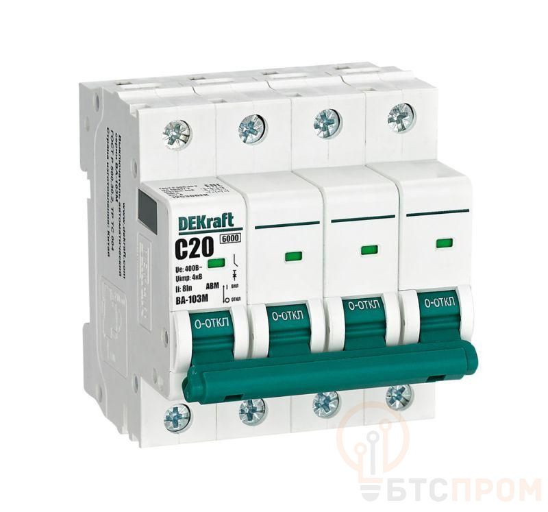 Автоматический выключатель без теплозащиты серии ВА-103M Dekraft; 4P; ном. ток 20 А; ном. раб. напряжение 400 В; кривая отключения C. Автоматические выключатели серии ВА-103М имеют специальное назначение для систем противопожарной защиты и вентиляции и выдерживают ток КЗ до 6000 А. Также они могут использоваться для нечастых оперативных включений и отключений указанных цепей. Автоматические выключатели соответствуют директиве RoHS, имеют расширенный диапазон рабочих температур от -25 до +60 °C, удобны и безопасны в эксплуатации.