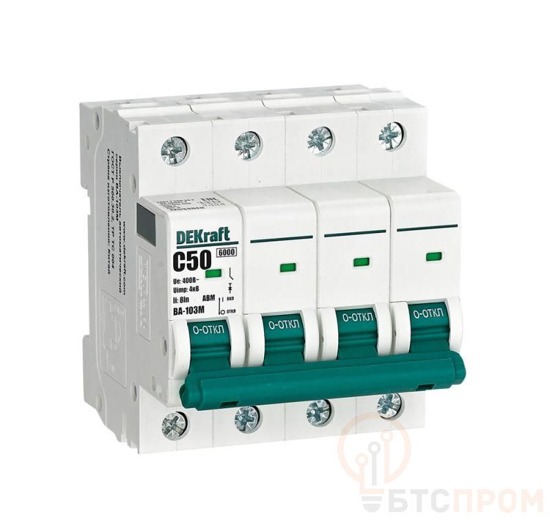 Автоматический выключатель без теплозащиты серии ВА-103M Dekraft; 4P; ном. ток 50 А; ном. раб. напряжение 400 В; кривая отключения C. Автоматические выключатели серии ВА-103М имеют специальное назначение для систем противопожарной защиты и вентиляции и выдерживают ток КЗ до 6000 А. Также они могут использоваться для нечастых оперативных включений и отключений указанных цепей. Автоматические выключатели соответствуют директиве RoHS, имеют расширенный диапазон рабочих температур от -25 до +60 °C, удобны и безопасны в эксплуатации.
