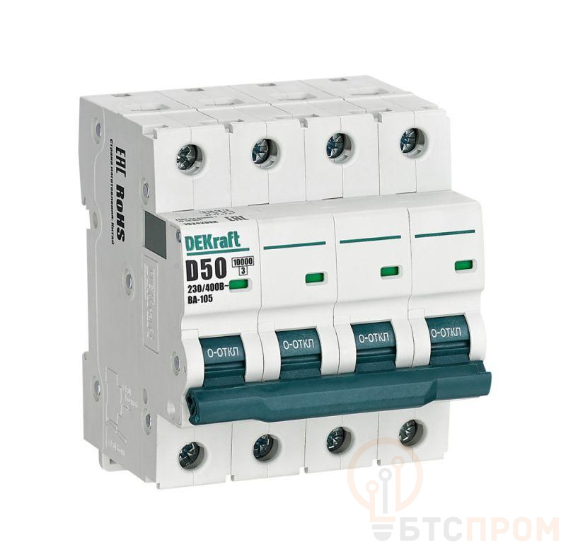 Автоматический выключатель серии ВА-105 Dekraft; 4P; ном. ток 50 А; характеристика D; откл. способность 10 кА; ширина модуля 18мм. Аппараты имеют механизм мгновенной коммутации, 6 монолитных заклепок, которые повышают прочность корпуса. Боковые каналы охлаждения повышают стабильность работы при высоких температурах окружающей среды. Есть возможность установки дополнительных аксессуаров с левой стороны устройства. Аппарат на 100% совместим с корпусами и оболочками Dekraft и Systeme Electric.