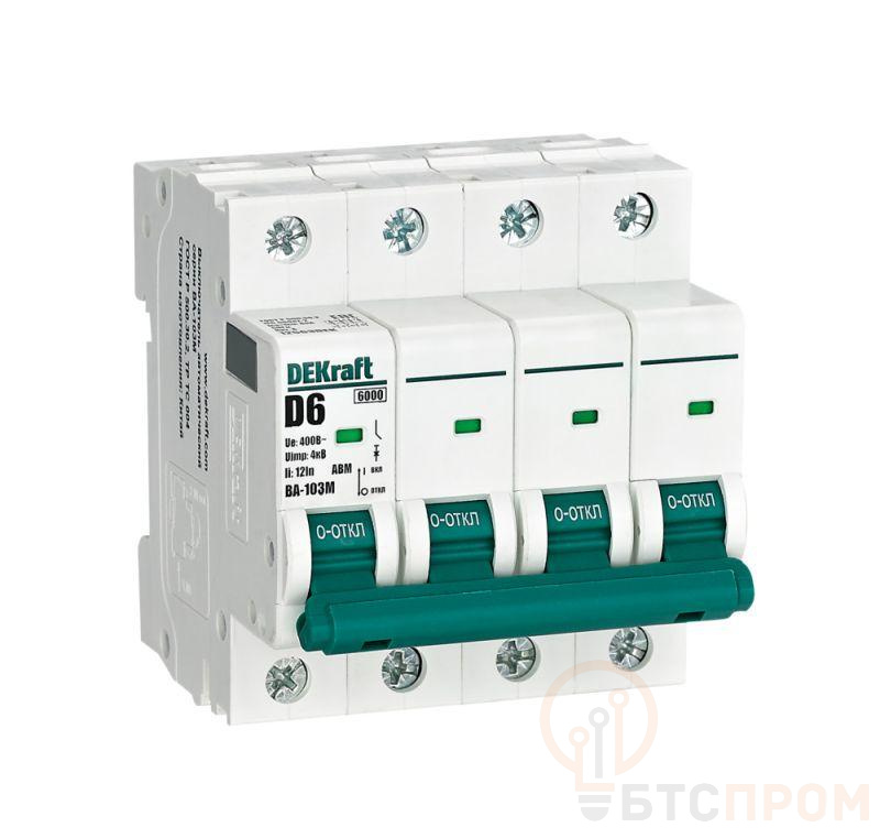 Автоматический выключатель без теплозащиты серии ВА-103M Dekraft; 4P; ном. ток 6 А; ном. раб. напряжение 400 В; кривая отключения D. Автоматические выключатели серии ВА-103М имеют специальное назначение для систем противопожарной защиты и вентиляции и выдерживают ток КЗ до 6000 А. Также они могут использоваться для нечастых оперативных включений и отключений указанных цепей. Автоматические выключатели соответствуют директиве RoHS, имеют расширенный диапазон рабочих температур от -25 до +60 °C, удобны и безопасны в эксплуатации.