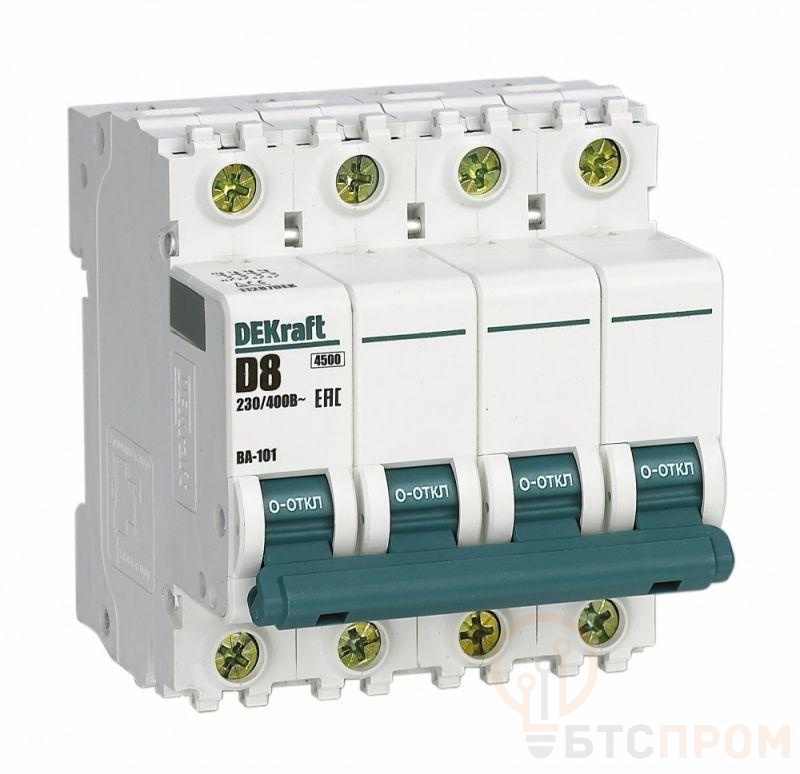 Автоматический выключатель серии ВА-101 Dekraft; 4P; номинальный ток 8 А; характеристика D; отключающая способность 4,5 кА. 5 монолитных заклепок повышают прочность корпуса аппарата. Сплошная лицевая панель обеспечивает безопасность эксплуатации аппарата. Боковые каналы охлаждения повышают стабильность работы при высоких температурах окружающей среды. Есть возможность установки дополнительных аксессуаров с левой стороны устройства.