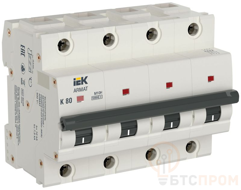 Автоматические выключатели ARMAT серии M10H предназначены для защиты цепей от перегрузки и короткого замыкания. Модельный ряд включает в себя устройства с характеристиками срабатывания B, C, D и Z, L, K на номинальные токи 80 и 100 А с числом полюсов от 1Р до 4Р. Номинальная наибольшая отключающая способность автоматических выключателей ARMAT серии M10H составляет 10 кА. Автоматические выключатели ARMAT серии M10H соответствуют ГОСТ IEC 60947-2 и ГОСТ IEC 60898-1. Конструкцией автоматических выключателей ARMAT серии M10H обеспечивается двойной разрыв контактной системы и двойная дугогасительная камера с совокупным числом де-ионных пластин 24, это двукратно увеличивает падение напряжения на электрической дуге в момент коммутации, за счет чего достигается быстрое и эффективное дугогашение.