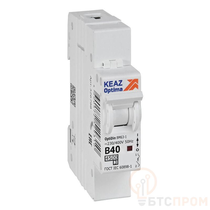Модульный автоматический 1 полюсный выключатель переменного тока с предельной коммутационной способностью при переменном токе 4,5 кА на номинальный ток 40 А.