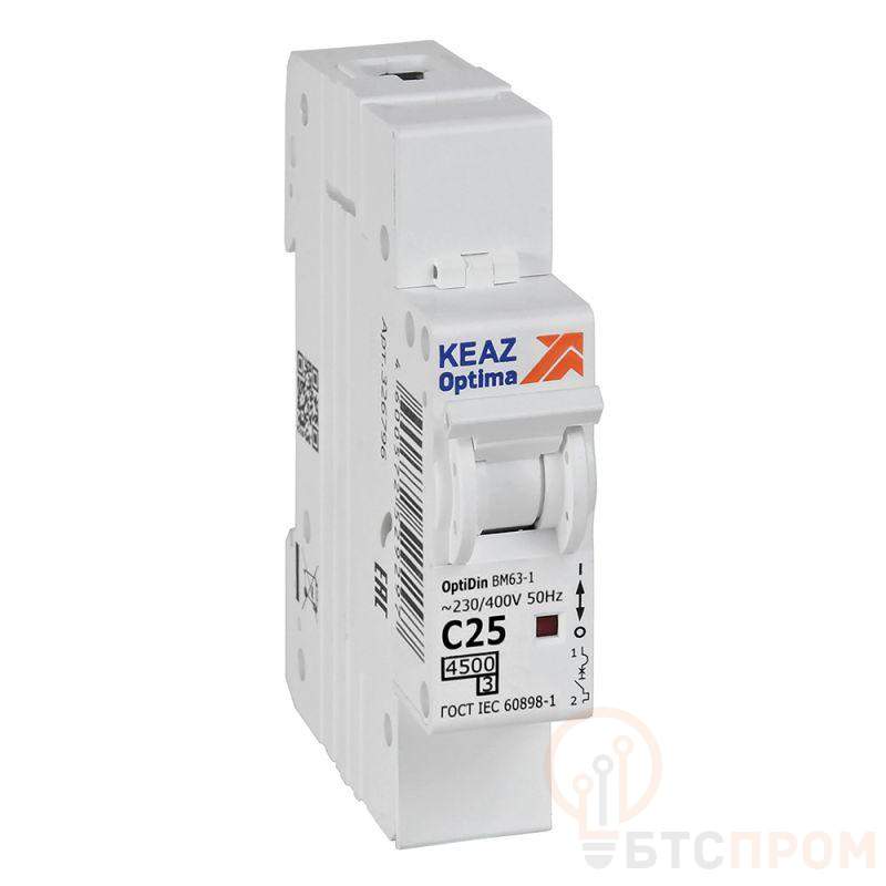 Модульный автоматический 1 полюсный выключатель переменного тока с предельной коммутационной способностью при переменном токе 4,5 кА на номинальный ток 25 А.