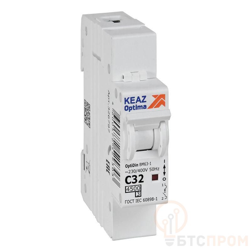 Модульный автоматический 1 полюсный выключатель переменного тока с предельной коммутационной способностью при переменном токе 4,5 кА на номинальный ток 32 А.