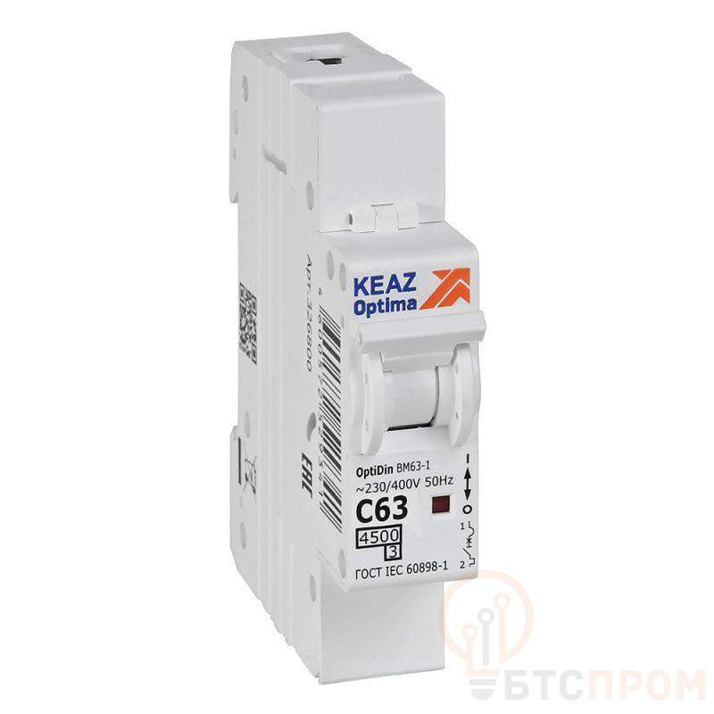 Модульный автоматический 1 полюсный выключатель переменного тока с предельной коммутационной способностью при переменном токе 4,5 кА на номинальный ток 63 А.