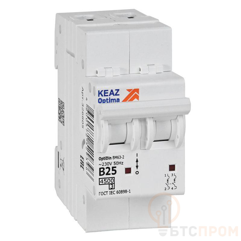 Модульный автоматический 2 полюсный выключатель переменного тока с предельной коммутационной способностью при переменном токе 4,5 кА на номинальный ток 25 А.