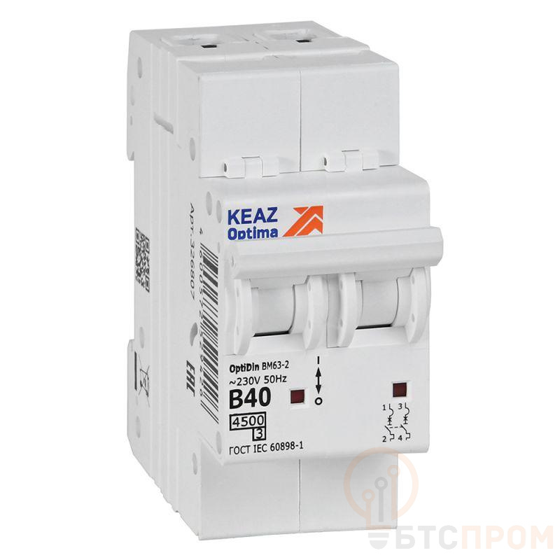 Модульный автоматический 2 полюсный выключатель переменного тока с предельной коммутационной способностью при переменном токе 4,5 кА на номинальный ток 40 А.