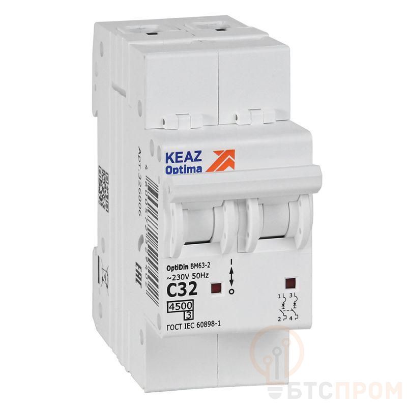 Модульный автоматический 2 полюсный выключатель переменного тока с предельной коммутационной способностью при переменном токе 4,5 кА на номинальный ток 32 А.