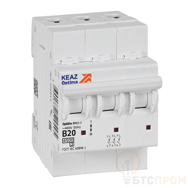 Модульный автоматический 3 полюсный выключатель переменного тока с предельной коммутационной способностью при переменном токе 4,5 кА на номинальный ток 20 А.