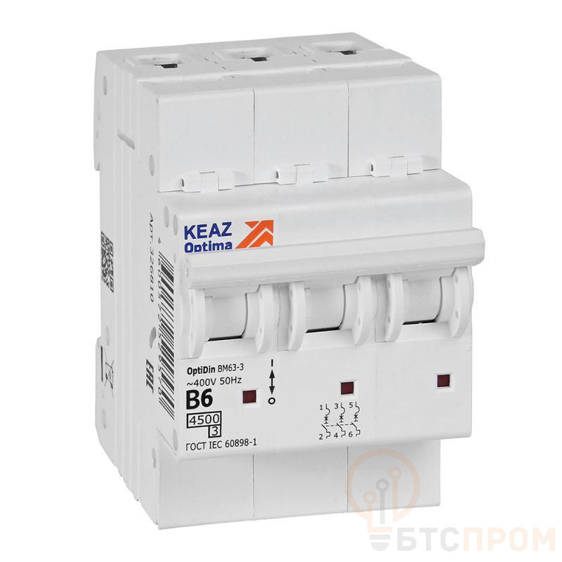 Модульный автоматический 3 полюсный выключатель переменного тока с предельной коммутационной способностью при переменном токе 4,5 кА на номинальный ток 6 А.