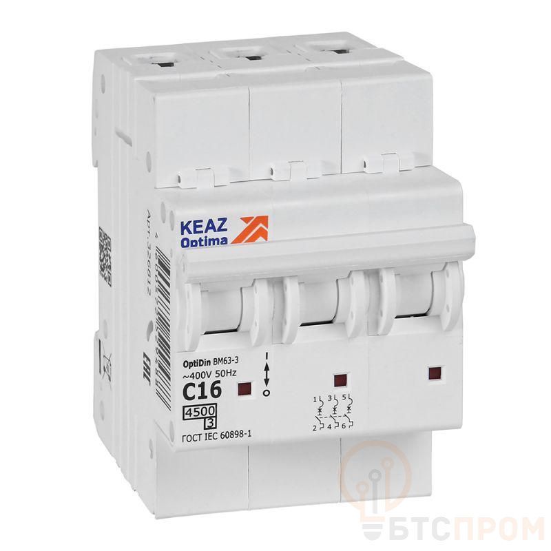 Модульный автоматический 3 полюсный выключатель переменного тока с предельной коммутационной способностью при переменном токе 4,5 кА на номинальный ток 16 А.