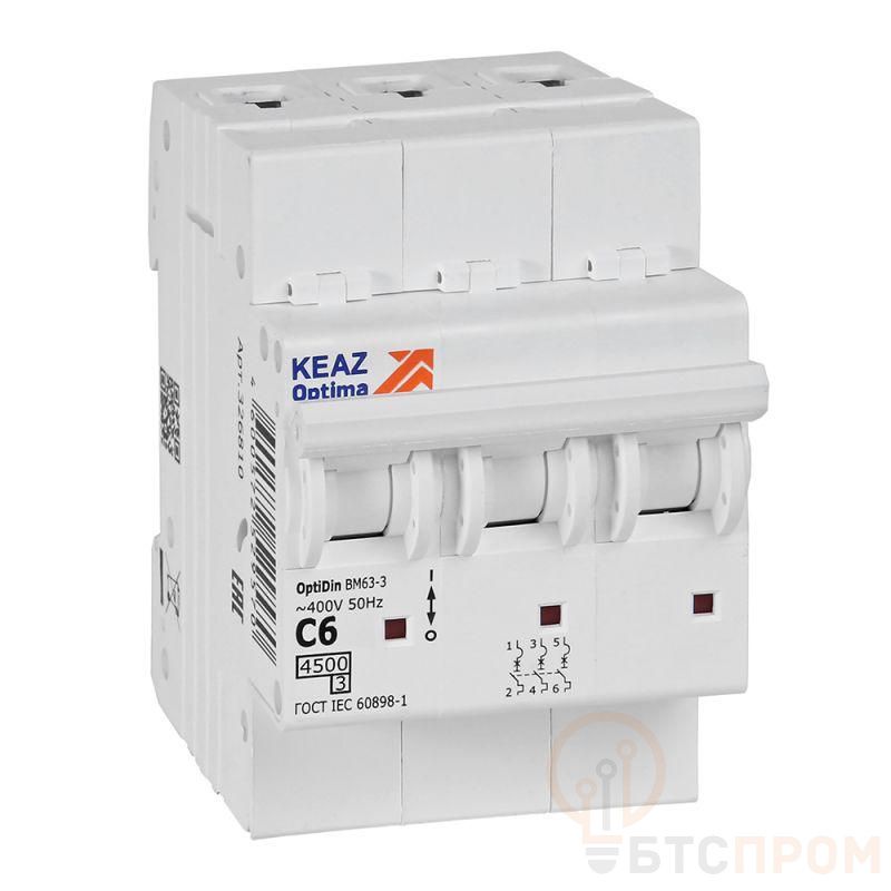 Модульный автоматический 3 полюсный выключатель переменного тока с предельной коммутационной способностью при переменном токе 4,5 кА на номинальный ток 6 А.