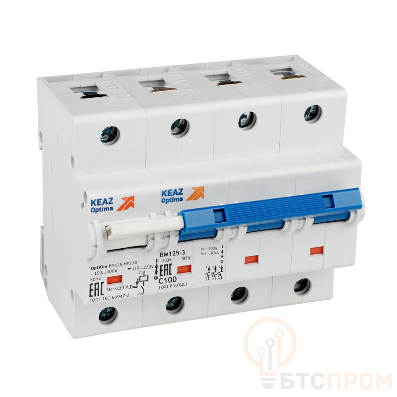 Выключатель автоматический модульный 3п C 100А 10кА OptiDin BM125-3C100-НР-8ln-УХЛ3 с независимым расцепителем КЭАЗ 336378