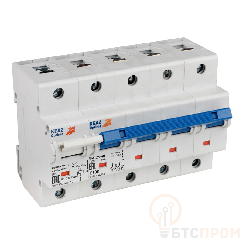 Выключатель автоматический модульный 4п D 100А 10кА OptiDin BM125-4ND100-НР-14ln-УХЛ3 с независимым расцепителем КЭАЗ 336386