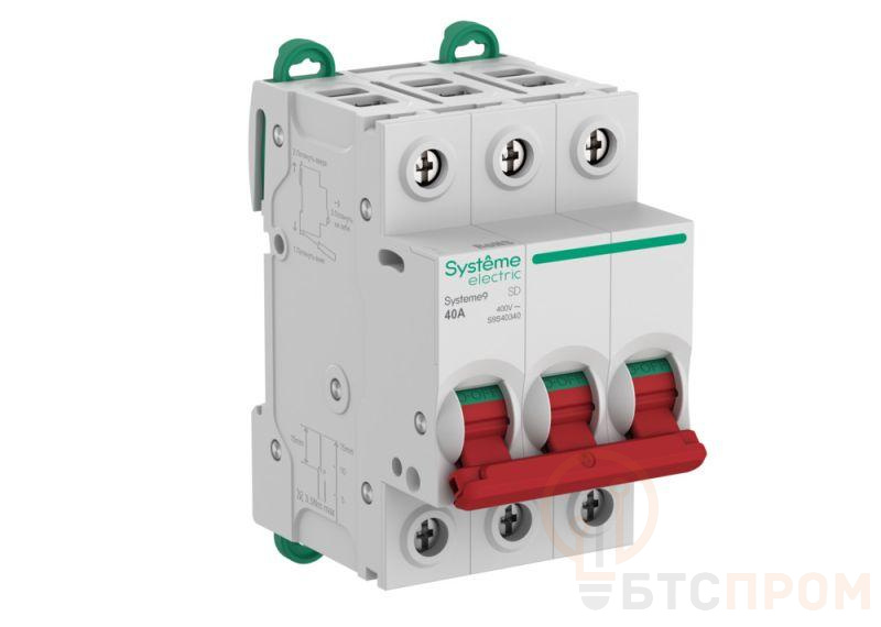 Выключатель-разъединитель S9S, серии Systeme9, Systeme Electric, 3-полюсный, номинальный ток 40 А, с красной рукояткой управления. Соответствует требованиям стандартов ГОСТ IEC 60947-3 и ГОСТ IEC 60669-2-4. Применяется в электрических сетях напряжением 400 В. Предназначен для включения и отключения нагрузок в электрических сетях. Категория применения AC-22A. Оснащен двойными безопасными клеммами раздельного монтажа проводников. Монтируется на DIN-рейку при помощи двухпозиционных защёлок, с возможностью демонтажа без снятия шины PIN.